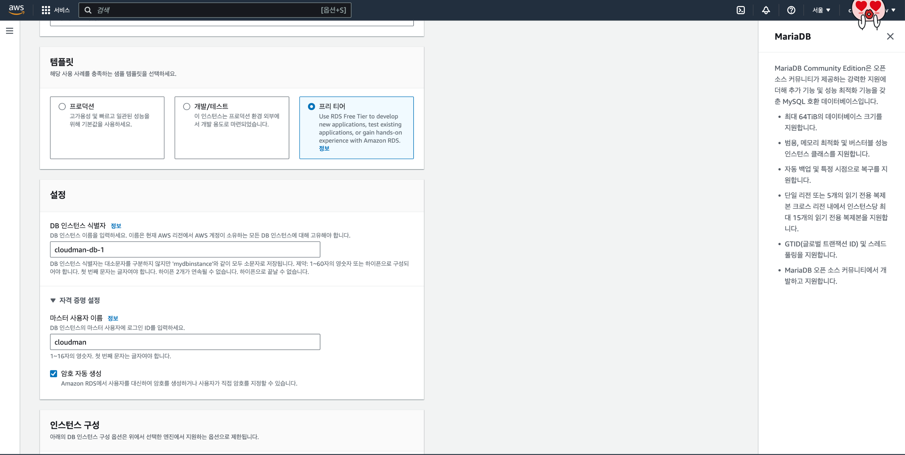 여기서 우리는 프리티어를 선택하고 인스턴스 식별자는 cloudman-db-1으로 만들겠습니다.