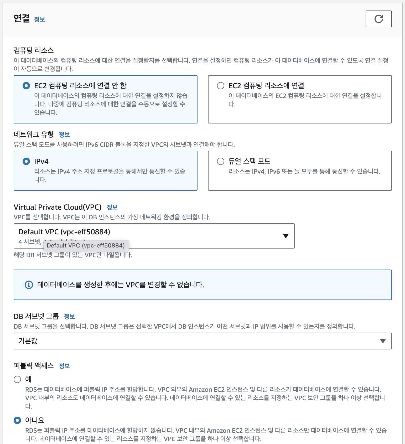 우선 EC2 컴퓨팅 리소스에 연결함 /연결 안함 의 옵션인데요.