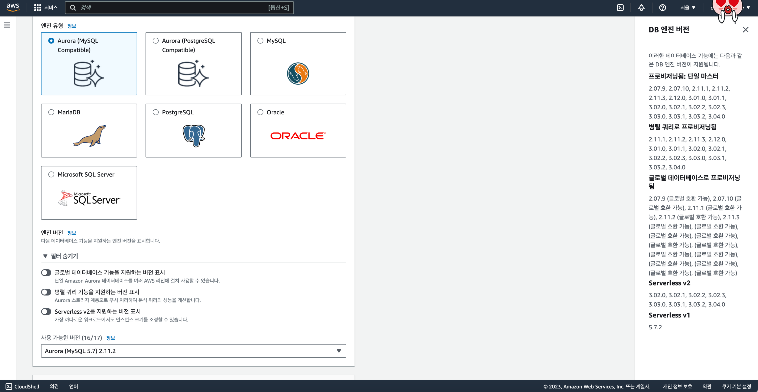 Aurora는 AWS에서만 제공하는 RDS인데, 보시는 것처럼 MySQL 혹은 PostgreSQL과 호환이 되는 DB 엔진을 제공합니다.