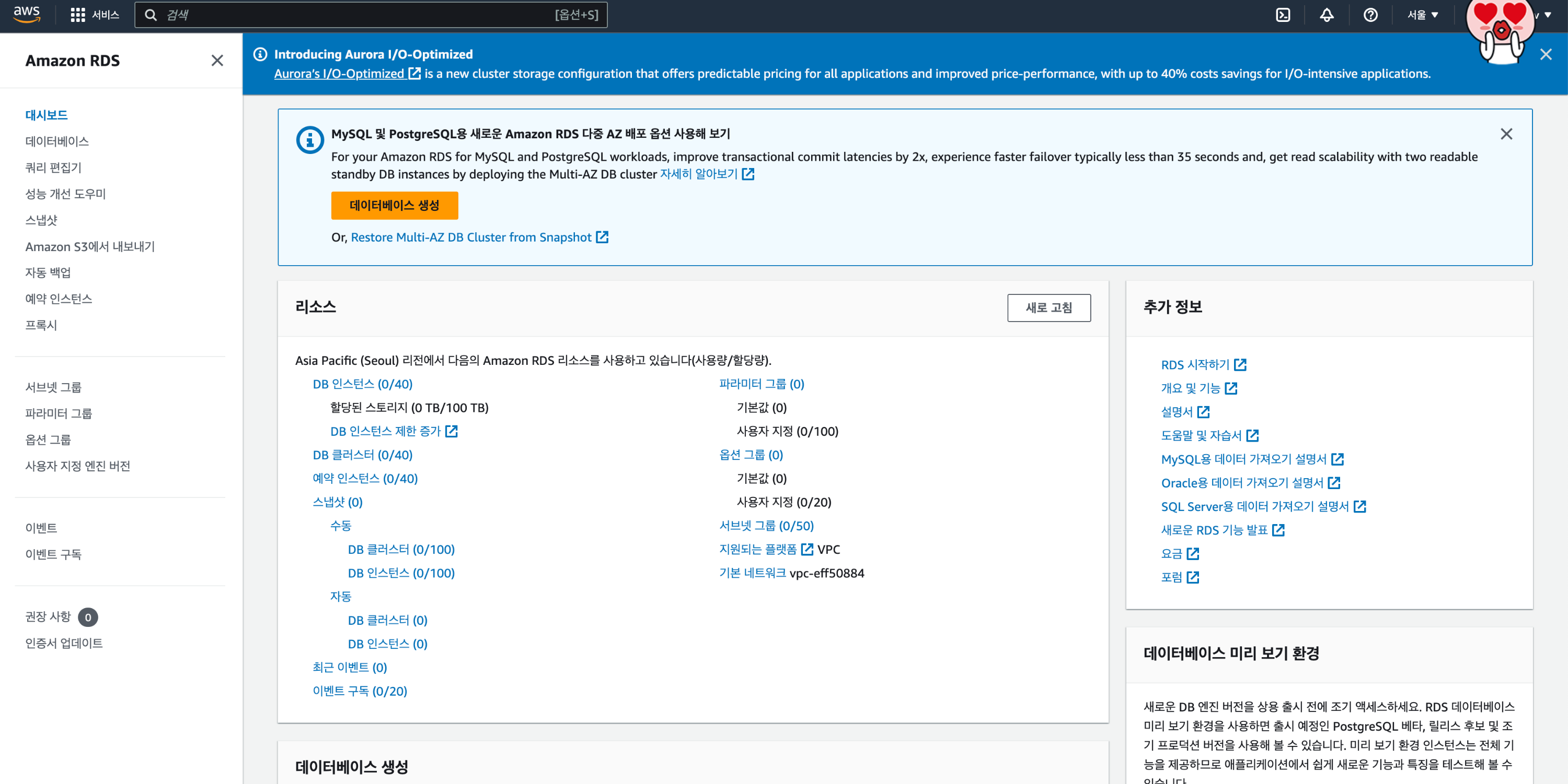 RDS 메인 화면 검색창에 RDS라고 검색해서 나오는 서비스를 클릭하면 보이는 화면처럼 RDS 메인화면으로 이동할 수 있습니다.