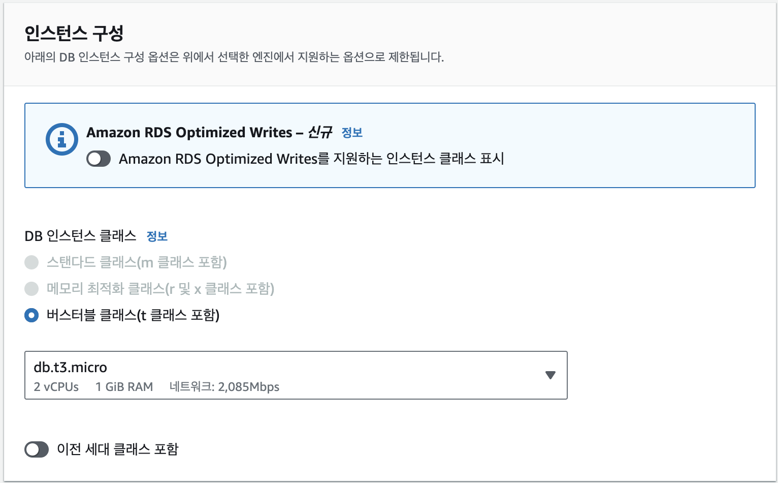 인스턴스 구성 밑으로 내려가면 인스턴스 구성이 보이는데요. DB가 설치되는 가상 컴퓨터의 사양이라고 보시면 됩니다.