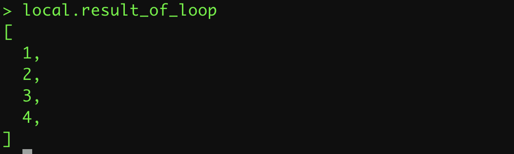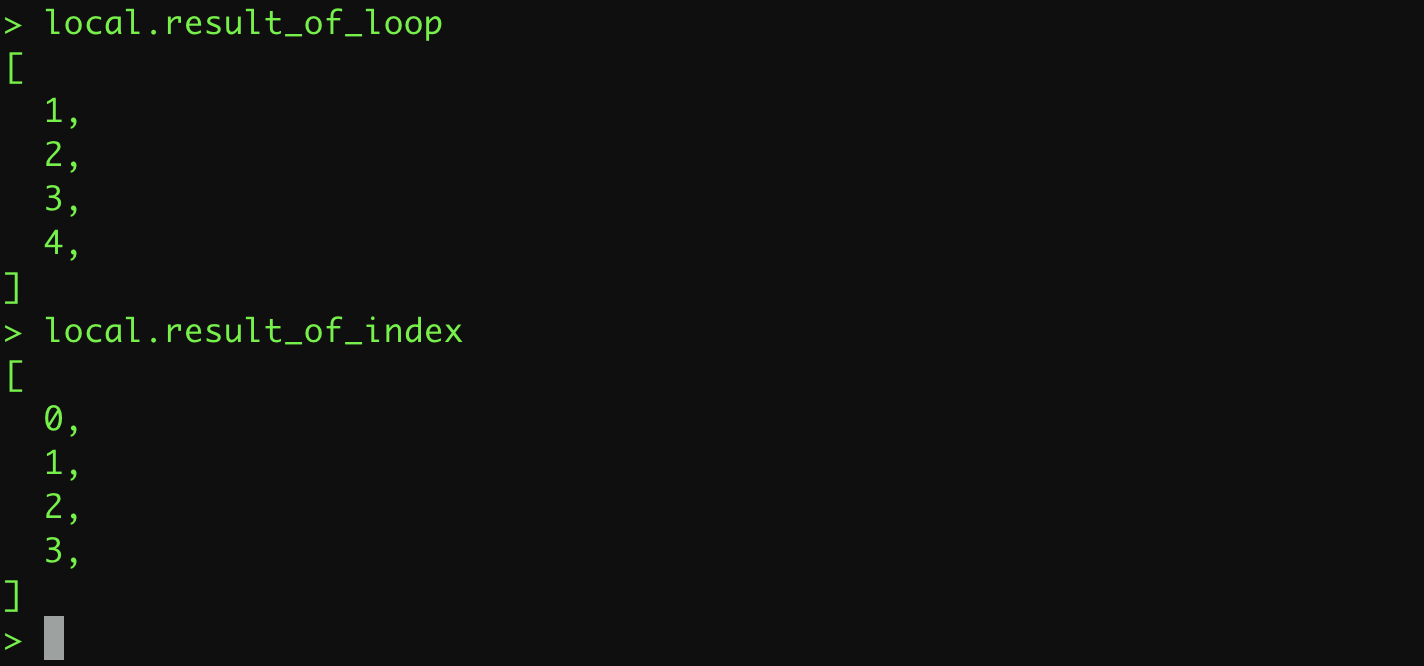 sample_tuple = [1,2,3,4] result_of_loop = [for index, element in local.sample_tuple: element] result_of_index = [for index, element in local.sample_tuple: index]
