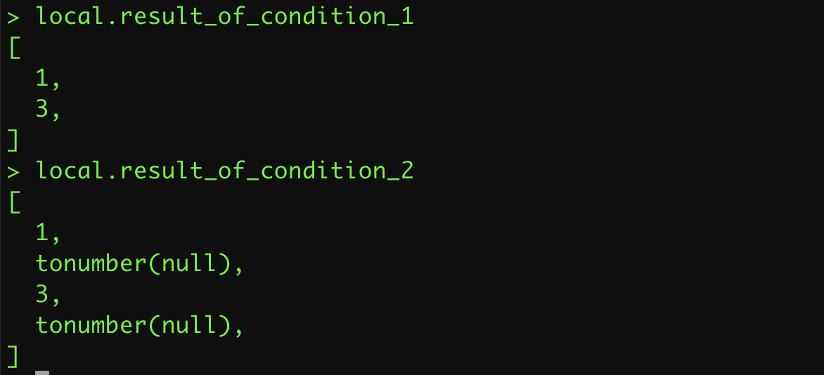 sample_tuple = [1,2,3,4] result_of_condition_1 = [for index, element in local.sample_tuple: element if index%2 == 0] result_of_condition_2 = [for index, element in local.sample_tuple: index%2 == 0 ? element:null]